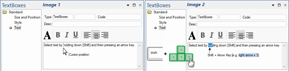 Text : Select text by holding down [Shift] and then pressing an arrow key. Text on templates can also be moved using this method.