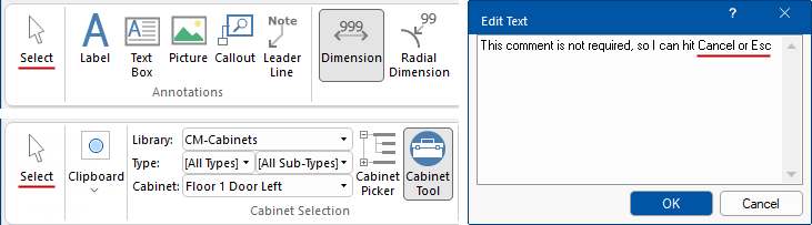This returns you to the Select command if another command (e.g. Diminesions) or tool (e.g. Cabinet Tool) is enabled, or reverts to the unedited contents when commenting in an Edit Text dialog.