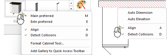 Detect Collision toggled on/off. When detection is off, the cabinet can overlap another cabinet. Note that the collision detection status of a cabinet is remembered when the drawing is saved. The current status of these settings can be seen by right clicking on the cabinet tool and looking at the right click menu, shown above right.