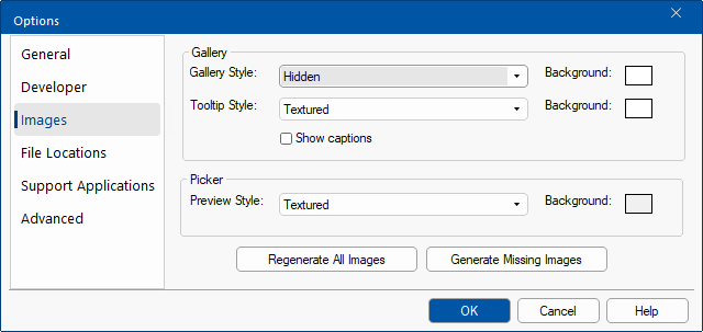 The Style of images displayed in the Gallery, Tooltip and Cabinet Picker can be customised individually on the Options [F10] > Images page.