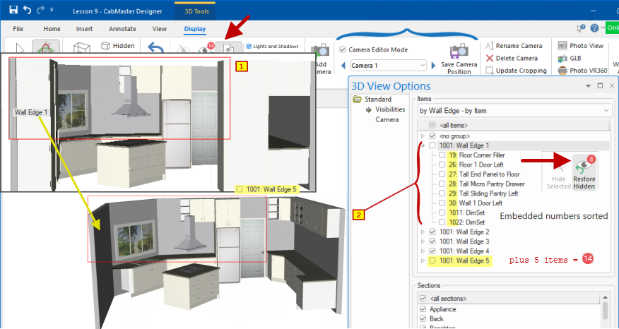 In the following example, "Camera Editor Mode" is turned on and (1) Camera 1 selected and then (2) Wall 1 cabinets (8 items) unchecked/hidden.