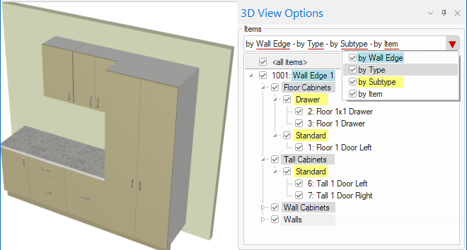 3D View Options has filtering hierarchical tree control to turn visibility on/off using the applicable dropmenu list checkboxes at the top i.e. by Wall/Type/SubType/Item, as shown.