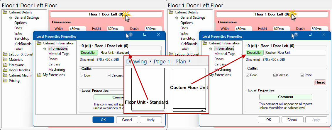 The default cabinet width MUST be saved in the catalog as part of the name as illustrated. The label will then automatically update to show the correct width when it is resized, as shown in the above examples.