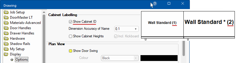This is a very popular option as the cabinet label dynamically changes to show the size of the cabinet as part of the label. When a cabinet is resized from it's default setting it is indicated by an asterisk (*) even if the cabinet width is not included in the name. As no changes were made to the other Wall Standard, no asterisk is displayed. See the discussion on LCM and User Defined below, which explains how this can be achieved.