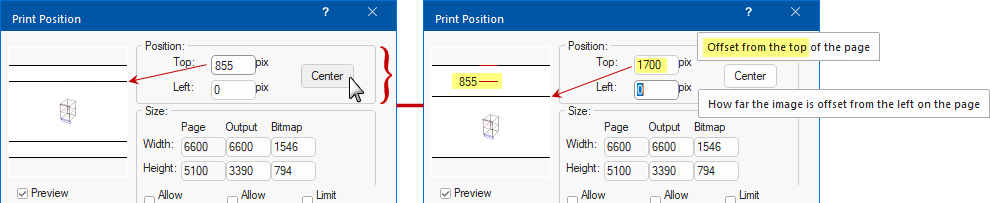 This example compares the top position changed from center (i.e. 855 pix) to 1700 pix from top.