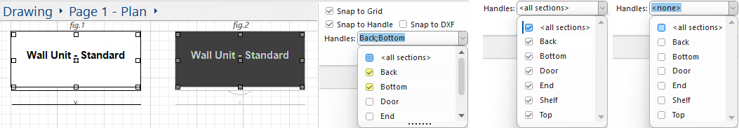 As can be seen on the simple cabinet shown here, handles appear on each corner as well as the midpoint of each side. They become (fig.1) visible when you move your mouse over an object, and (fig.2) become filled in when you select it. Handles also makes placing Dimensions much simpler. Be sure to set it back to <none> when finished by unticking the <all sections> option, as shown below right.