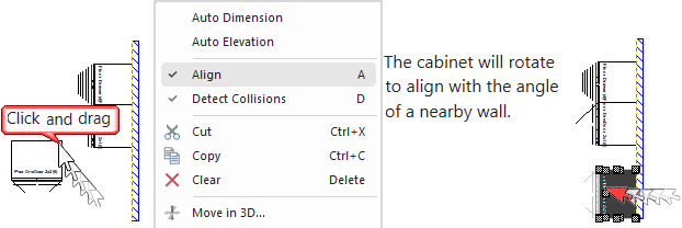When alignment is On, the cabinet will try to rotate to align with the angle of a nearby wall.