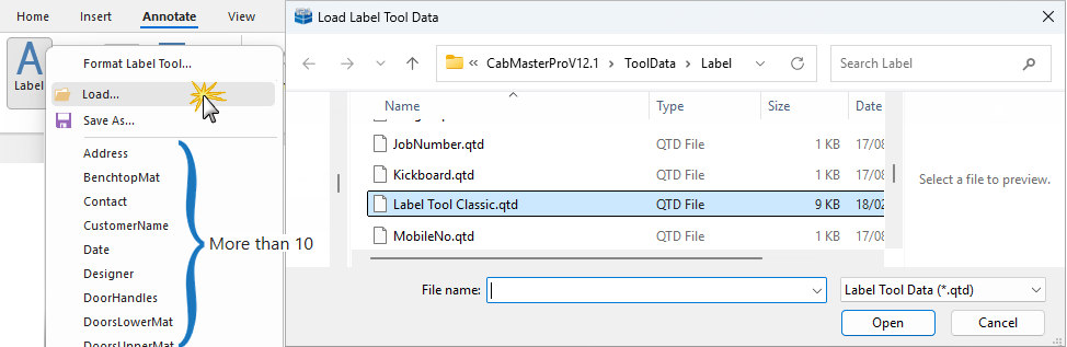 You may need to use the Load command if the Label Tool Classic QTD file required is not on your list - remember the list only displays up to 10 available tools (in alphabetical order). When selected the following dialog is presented and you can simply select the required tool file, as shown.