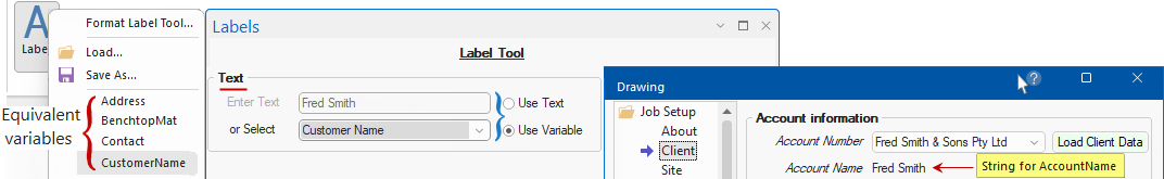 This example shows how the Label Classic Tool variable "Customer Name" picks up the Account Name provided in the Drawing properties.