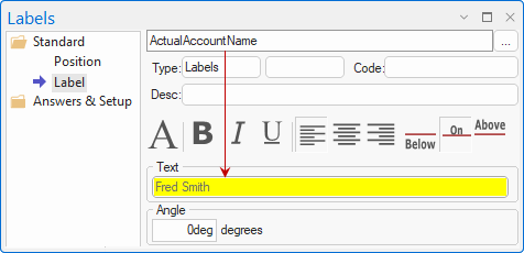The Text edit box allows you to set the text that will be displayed and is therefore the most important control on this page. As you type into the Text box, the label will update itself if it is visible on the drawing page.