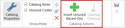 If the Unused Codes check box is ticked (i.e. Show) but the Catalog Items is unticked (i.e. Hide) it will display only those cabinets that will not be made available in the cabinet selection on the Home tab (as shown above right).