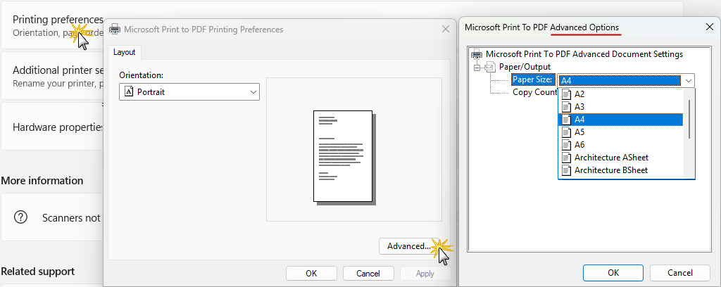 - In this example, we clicked on the Microsoft Print to PDF option, as shown above in step 1, to access the following settings.