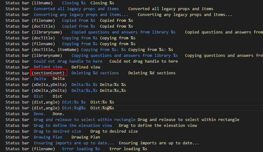 Column 2: The purpose of the (sectionCount) is to explain what the %d parameter is for…. eg a sectionCount of 5 would mean the user sees the string “Deleting 5 sections” or its translation… which may have the 5 in a different place in the foreign language string. (Therefore compatible with ChatGPT)