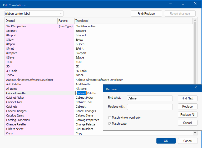 Find/Replace dialog within translations editor for doing batch updates for common words