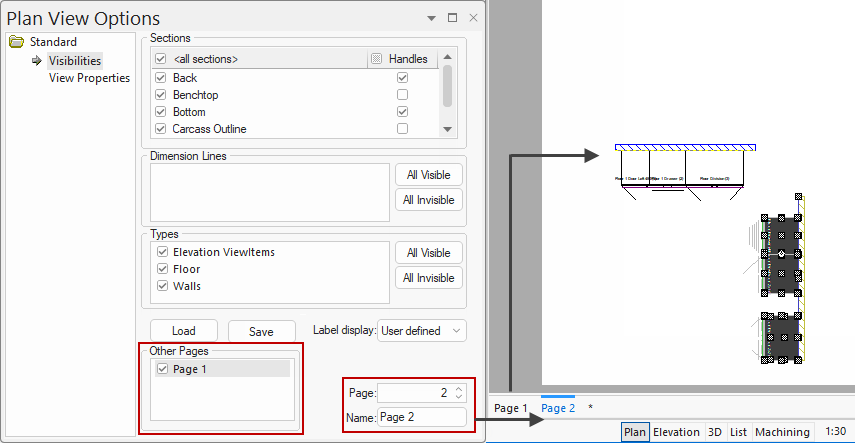 In the following simple example, Page 1 has a horizontal wall with cabinets and Page 2 has a verticle wall with cabinets (which is the selected page). By ticking the Other Pages checkbox for Page 1 a copy of page 1 is presented on Page 2. This allows you to move/modify the wall/cabinets from Page 1 exactly the same as if it was on that page.