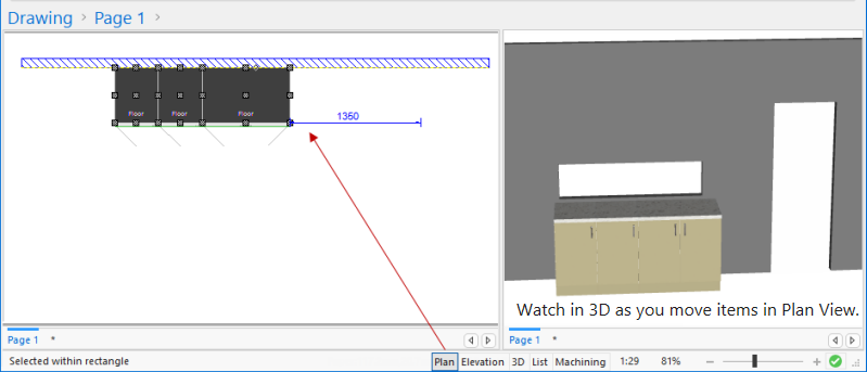 The Split command can be used to have multiple views. As shown here, we have moved the cabinet under the hole we created and moved the cutout down to just above the cabinet. As items are moved or changed, the 3D image will automatically update.